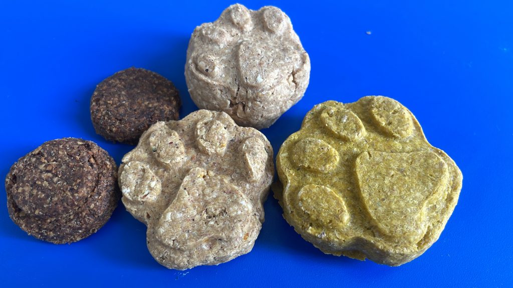 Se obtuvieron dos tipos de alimento: croquetas y premios para perro; los premios se hicieron de tres formas diferentes; las croquetas presentaron tamaños variados, aptos para perros de talla pequeña a talla grande.