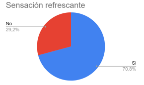 Los resultados de la encuesta son los siguientes: En una primera etapa con la formulación con 14.16% de emulsionante. Se realizó una encuesta a 24 individuos con rangos de edad de los 10 a los 63 años, 30% de género masculino y 70% de género femenino. Los resultados de la encuesta con respecto a la consistencia se pueden observar en la Gráfica 1, con respecto a la humectación en la Gráfica 2, la sensación refrescante en la Gráfica 3 y la valoración del producto en la Gráfica 4 (las gráficas pueden consultarse en la sección de apéndices).