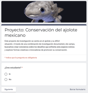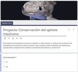 Este proyecto de investigación se centra en el ajolote y su difícil situación. A través de una combinación de investigación documental y de campo, buscamos crear conciencia sobre los desafíos que enfrenta esta especie icónica y explorar formas creativas e innovadoras de promover su conservación.
