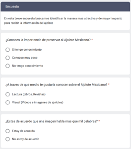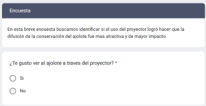 Para medir el impacto de nuestra propuesta decidimos hacer llegar una encuesta a quienes tuvieron oportunidad de conocer del ajolote y su conservación a través de nuestro proyector.