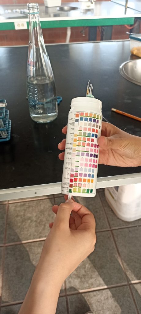 3. Sumerge una tira reactiva en cada muestra de agua durante el tiempo indicado en el instructivo.