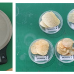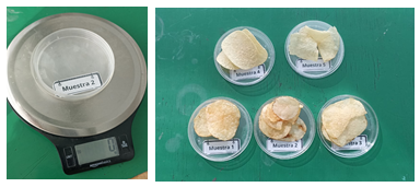 1. Colocamos 22 gramos de las diferentes marcas de papas fritas en platos separados, una papa para cada integrante del equipo. Nuestras mamás nos ayudaron a preparar la muestra, ya que es importante que quien realiza la prueba no vea las marcas.