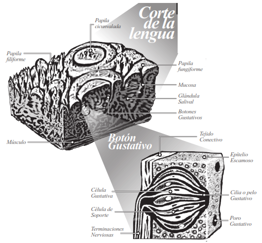 Los alimentos introducidos en la boca son disueltos en la saliva, penetrando las papilas gustativas a través de los poros que hay en la lengua.