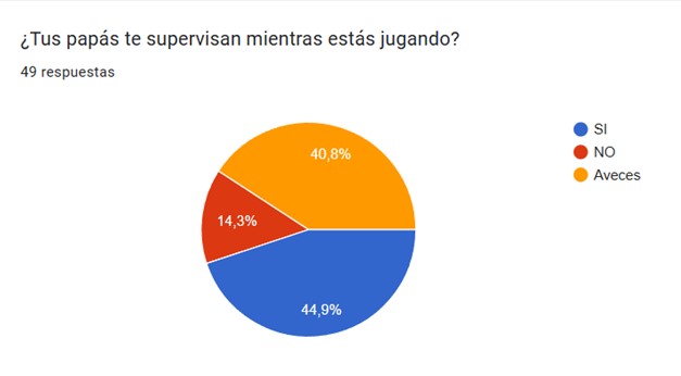 El 75.5% de los alumnos encuestados respondió que cuando algún adulto les indica que dejen de jugar es el momento en que termina el tiempo para ellos, el 42.9% contestó porque ya se aburrieron, el 30.6% tiene un control parental instalado en sus dispositivos, el 24.5% comento porque se le acabo la pila del dispositivo, y las opciones yo decido cuanto tiempo jugar y porque me desespere de jugar fueron respondidas por el 18.4% respectivamente. Cabe aclarar que esta fue una respuesta de opción múltiple.